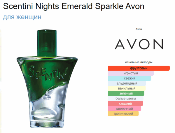 Scentini Nights Emerald Sparkle Eau de Toilette Avon, выпущенный в 2012 году, классифицируется как аромат для женщин и принадлежит семействам Фруктовые и Цветочные.