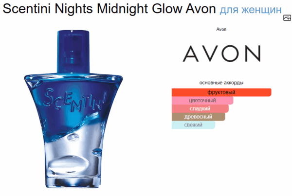 Scentini Nights Midnight Glow Eau de Toilette Avon, выпущенный в 2012 году, классифицируется как аромат для женщин и принадлежит семействам Фруктовые и Цветочные.