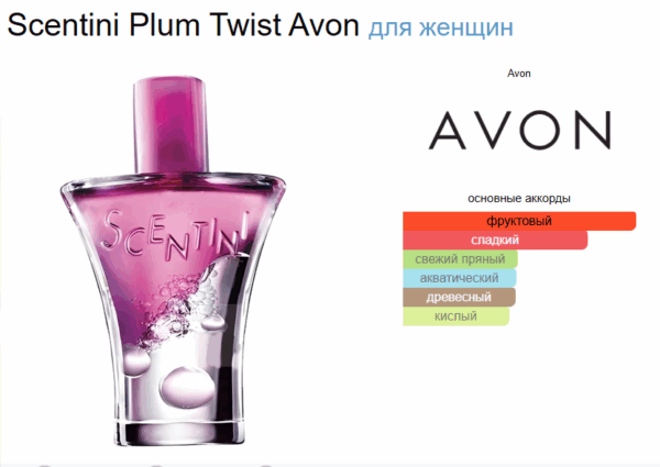 Scentini Plum Twist Eau de Toilette Avon, выпущенный в 2011 году, классифицируется как аромат для женщин и принадлежит семействам Фруктовые и Цветочные.
